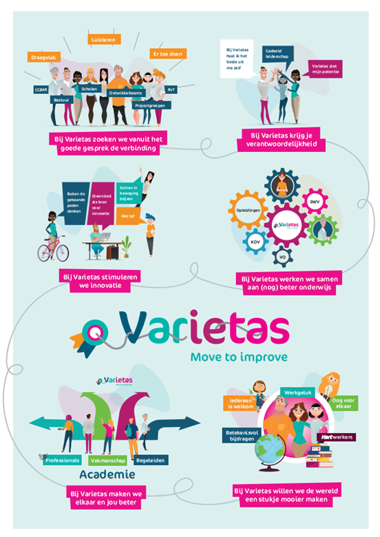 Binnen Varietas werken echte hartwerkers. Wij stropen de mouwen op, maar werken ook altijd vanuit ons hart. Binnen Varietas zien wij diversiteit als de bron voor bloei. Belangrijke merkwaarden voor ons zijn: ambitieus en met lef ontwikkelen, het zoeken van verbindingen, de passie om van betekenis te zijn en elkaar en de wereld een stukje beter te maken en waar nodig en wenselijk te zoeken naar eenheid in verscheidenheid en inspiratie door variatie. Dat doen wij met professionele en bevlogen medewerkers, zowel op de scholen als op het bestuurskantoor.